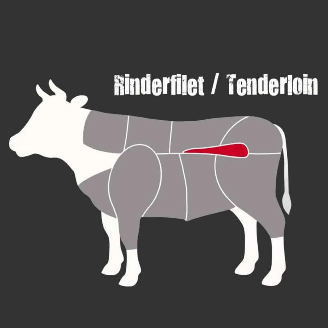 Das Rinderfilet oder Tenderloin zählt durch seine unglaubliche Zartheit zu den beliebtesten Teilstücken des Rindes. Dabei handelt ist sich um den Musculus Psoas Major (großer Lendenmuskel), der unter dem Roastbeef sitzt.