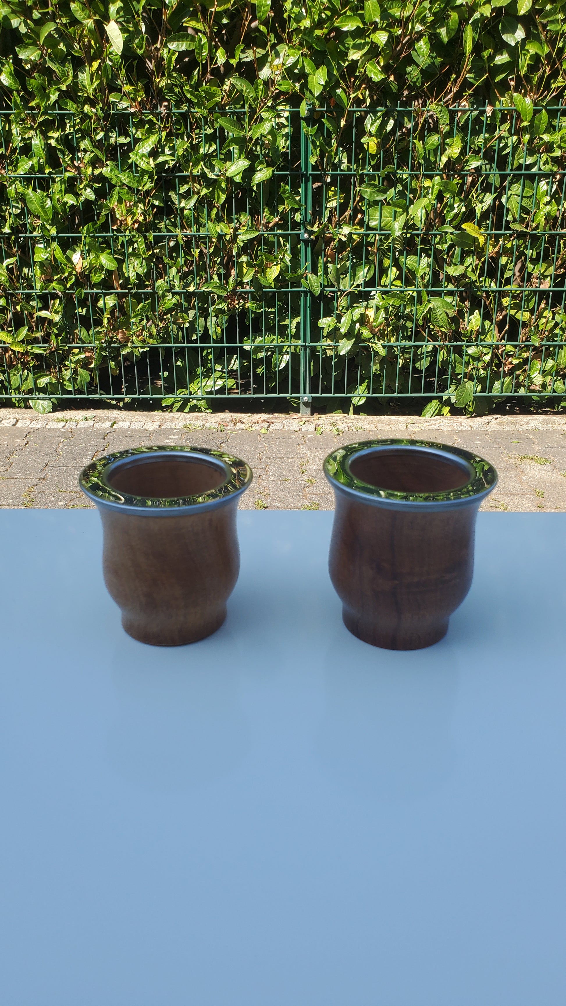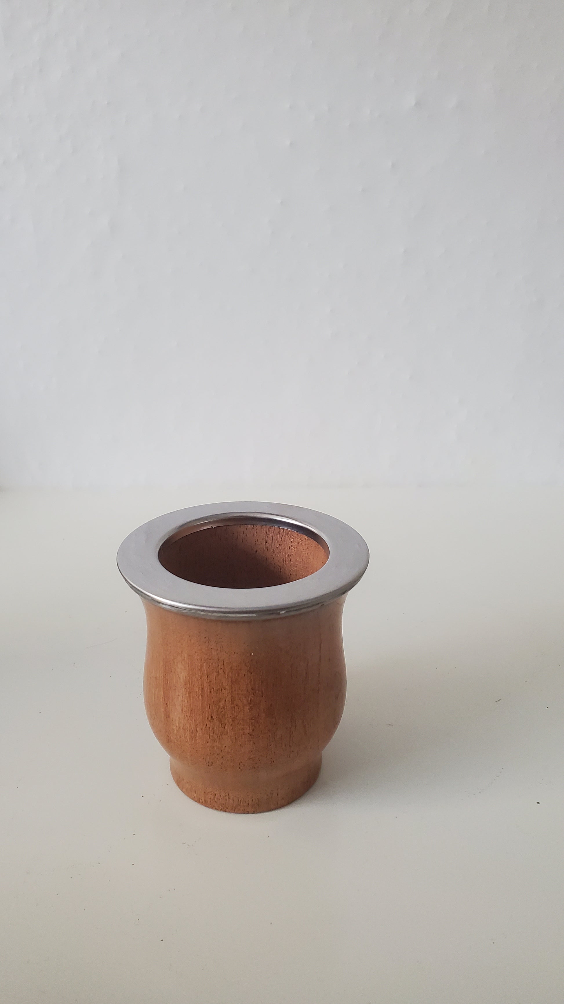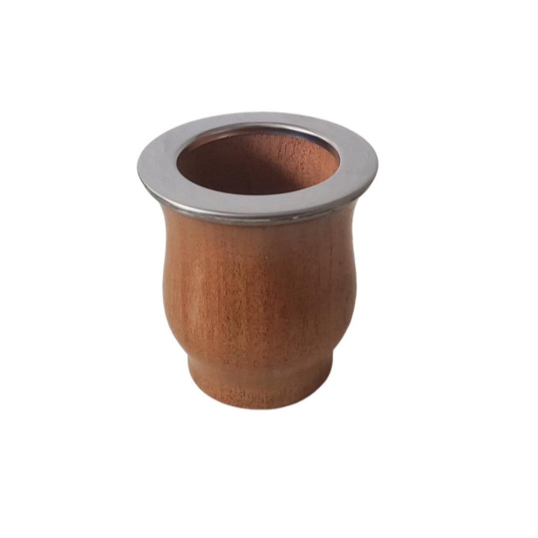 Mate de Algarrobo. Ein Mate aus Holz des Johannesbrotbaums. Handgefertigt in Argentinien. Die Metallzwinge ist aus Edelstahl gefertigt und dadurch, dass der Mate nicht mit Leder überzogen wurde, ist dieser sogar vegan. Holz hat den Vorteil gegenüber Kürbis, dass dies schneller trocknet und somit die Gefahr der Schimmelbildung (gerade im Winter) stark reduziert ist. Tendenziell ist der Geschmack im Holz etwas intensiver als beim Kürbis, aber auch hier gilt zu beachten: Den Mate immer trocken lagern allerdings nie zu lange vor der Heizung oder in der Sonne stehen lassen, da das Holz sonst zu trocken wird.