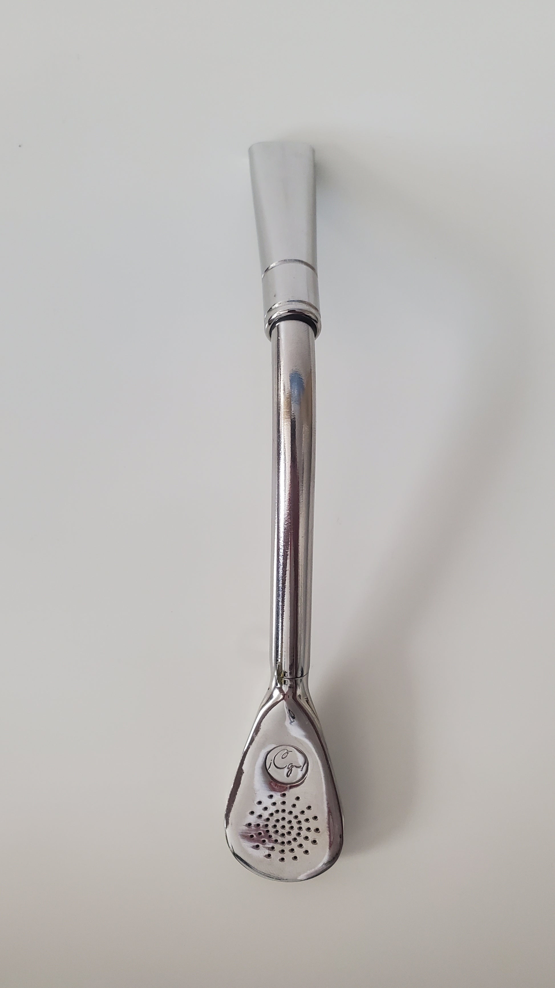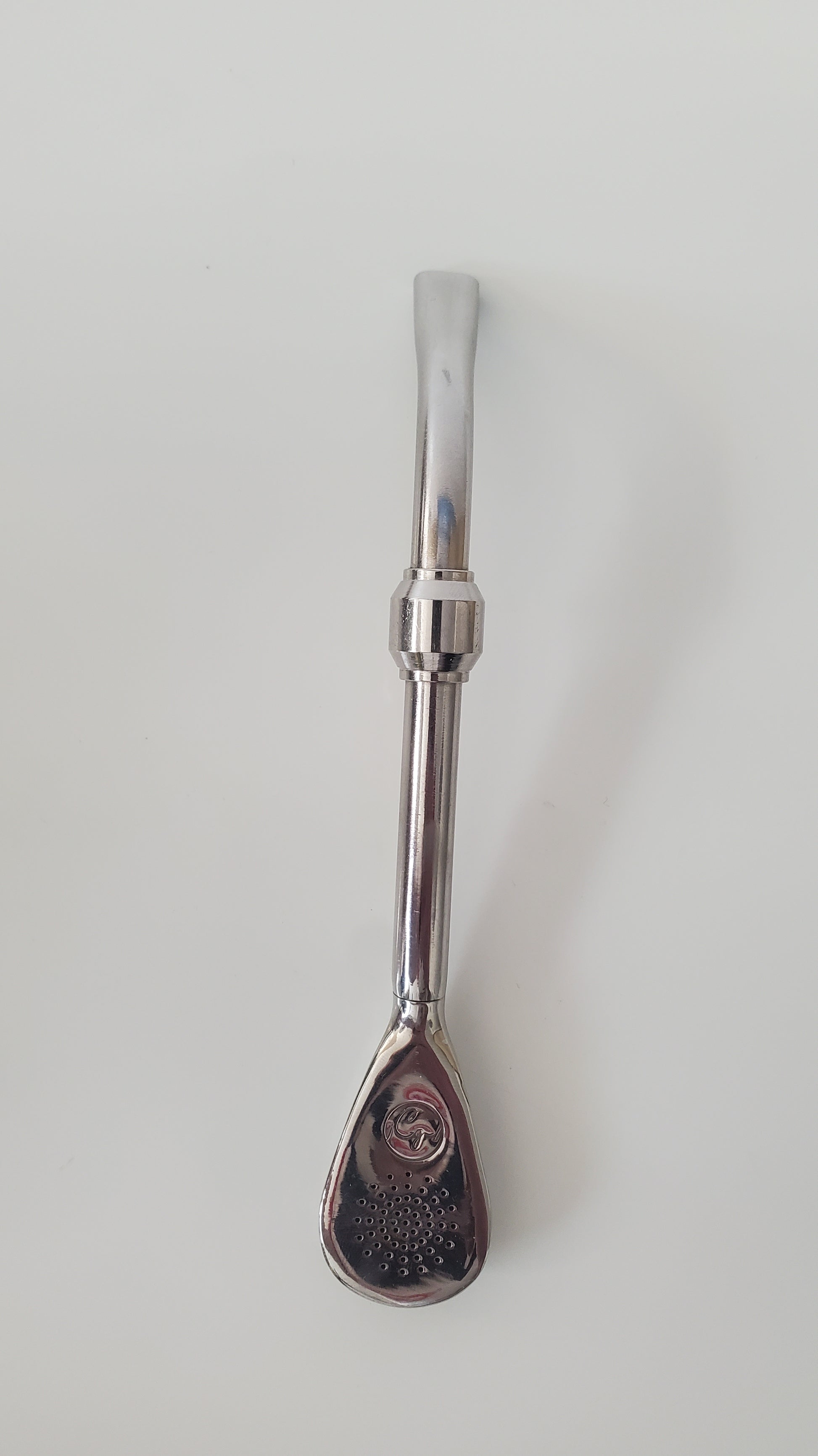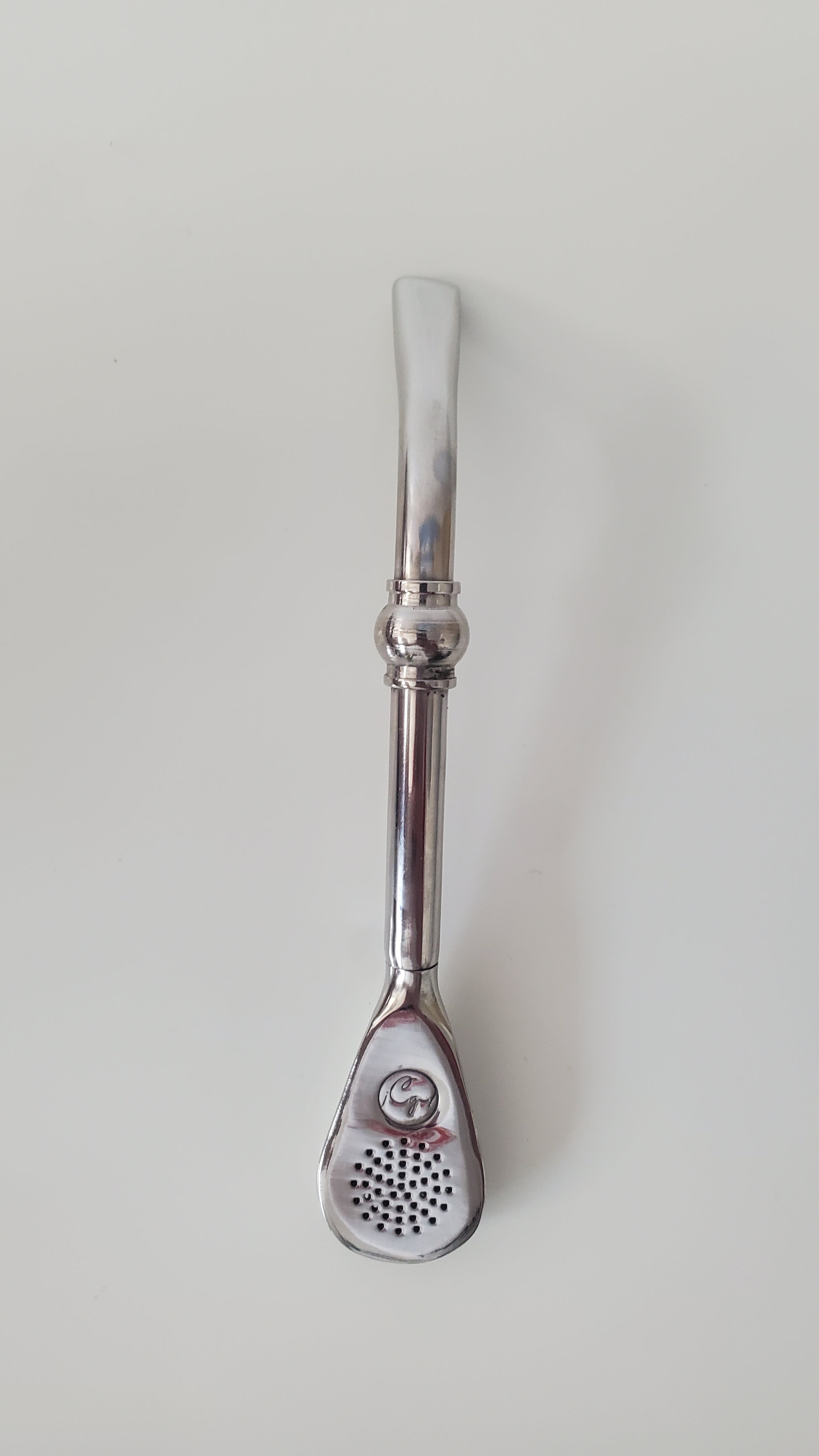 Handgefertigt in Argentinien. Das Rohr ist 10 mm dick und das Mundstück je nach Variante 10 (Bei der Variante mit Stein) oder 12,5 mm dick. Der Filter ist in Form eines Löffels und mikroperforiert. Des Weiteren hilft die rundliche Form des Löffels (uruguayischer Stil) dabei, dass diese Bombila auch bei Yerbas des Stils PU1 (feingemahlen, uruguayisch) nie verstopft.