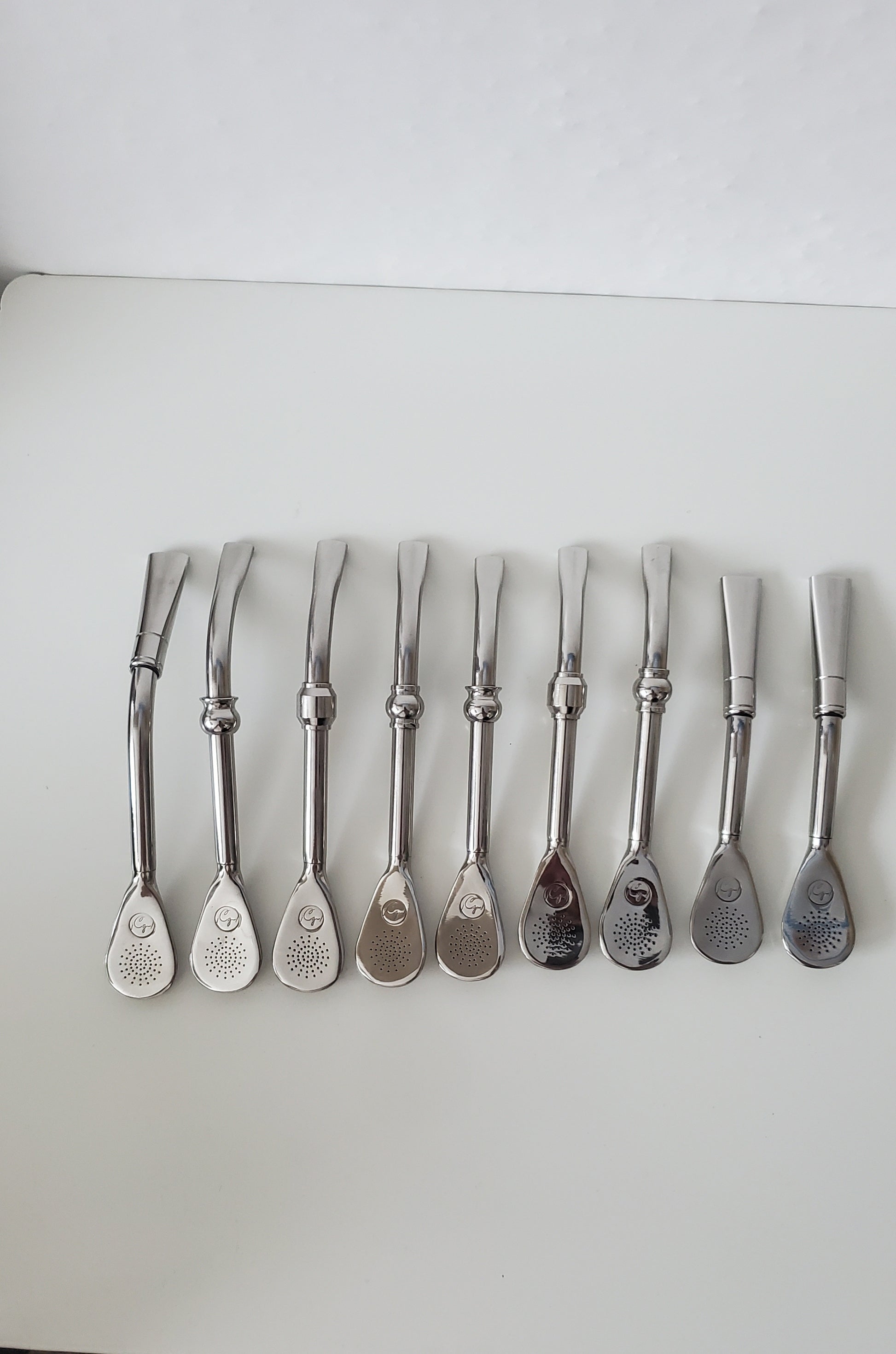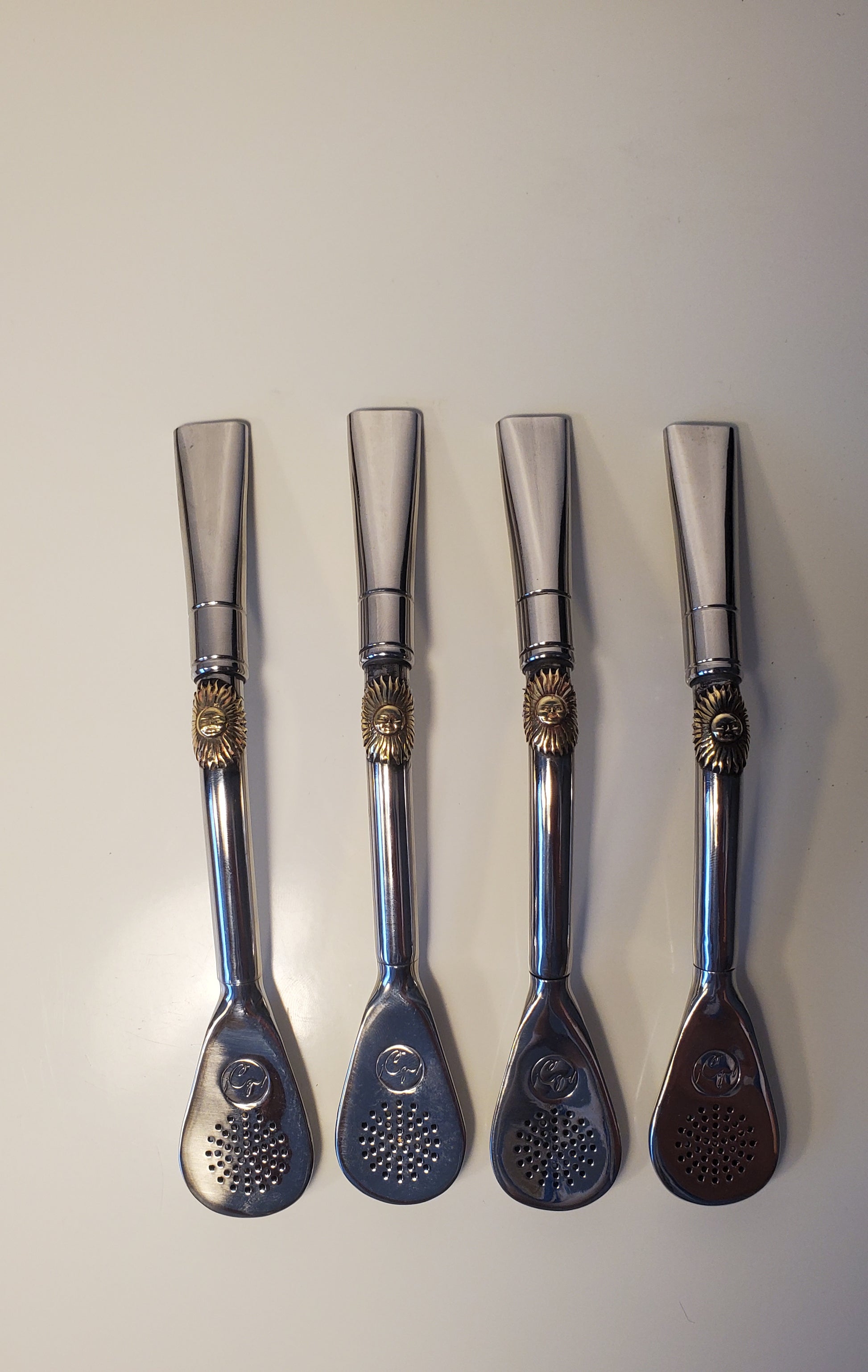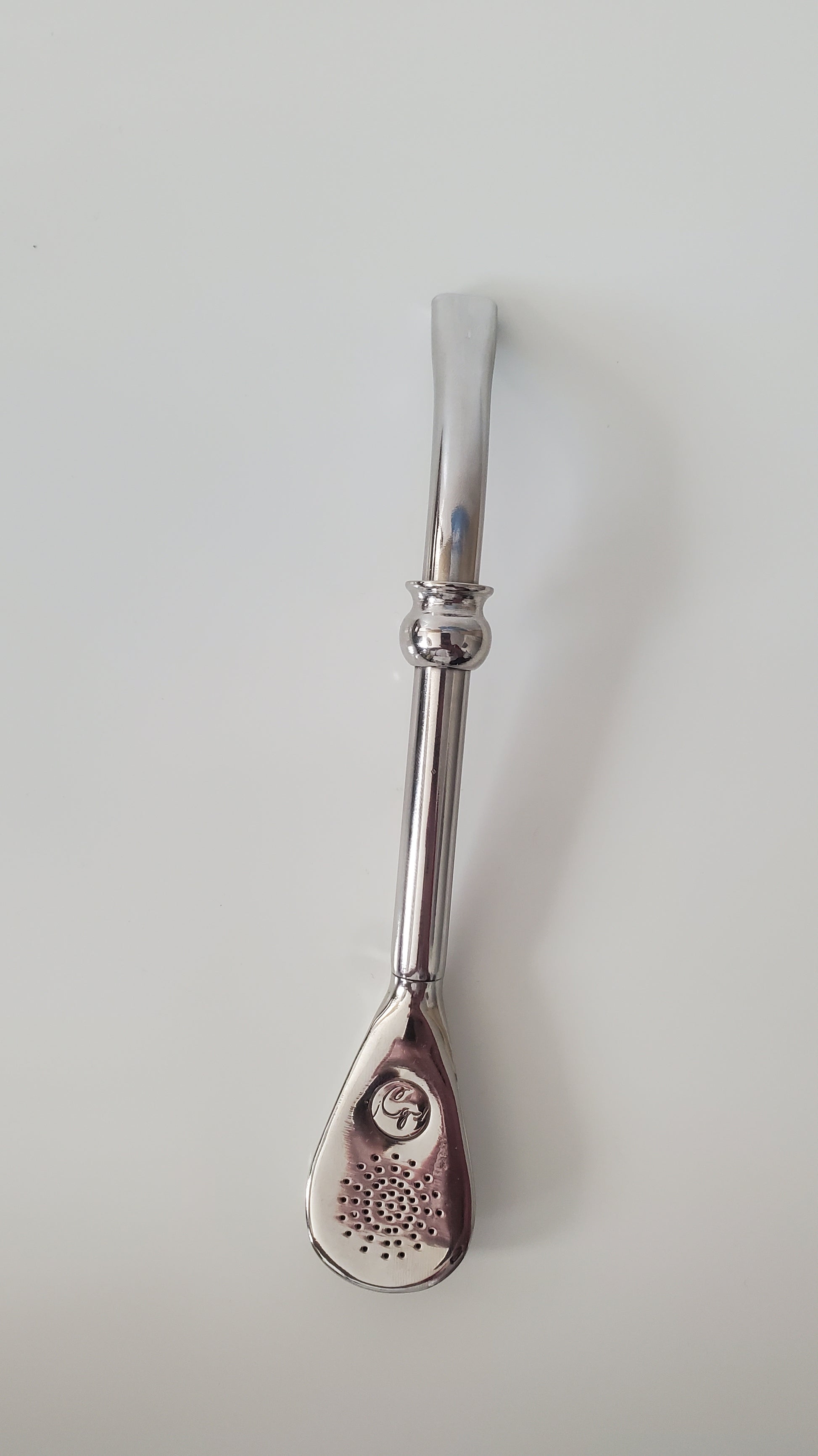 Handgefertigt in Argentinien. Das Rohr ist 10 mm dick und das Mundstück je nach Variante 10 (Bei der Variante mit Stein) oder 12,5 mm dick. Der Filter ist in Form eines Löffels und mikroperforiert. Des Weiteren hilft die rundliche Form des Löffels (uruguayischer Stil) dabei, dass diese Bombila auch bei Yerbas des Stils PU1 (feingemahlen, uruguayisch) nie verstopft.