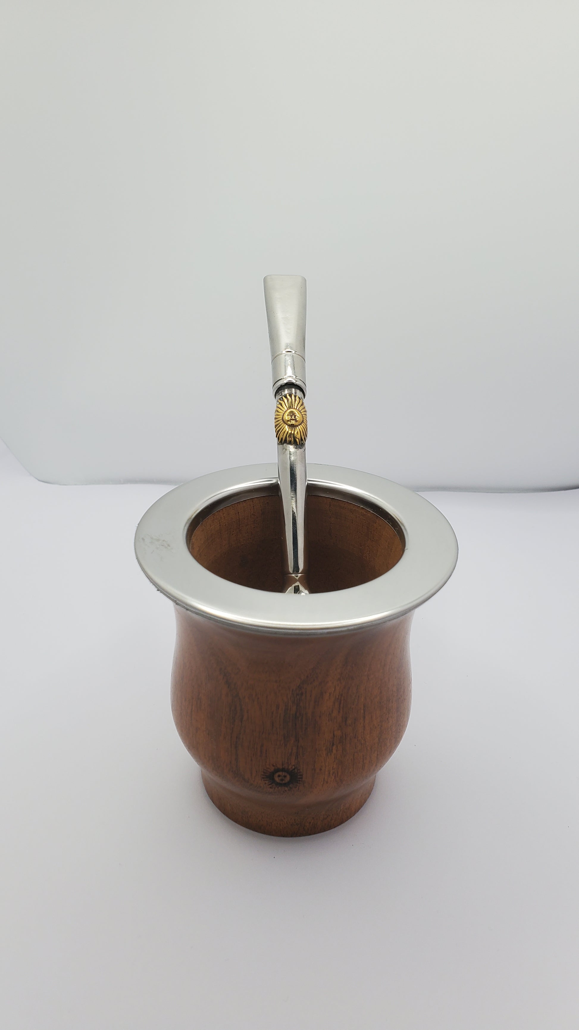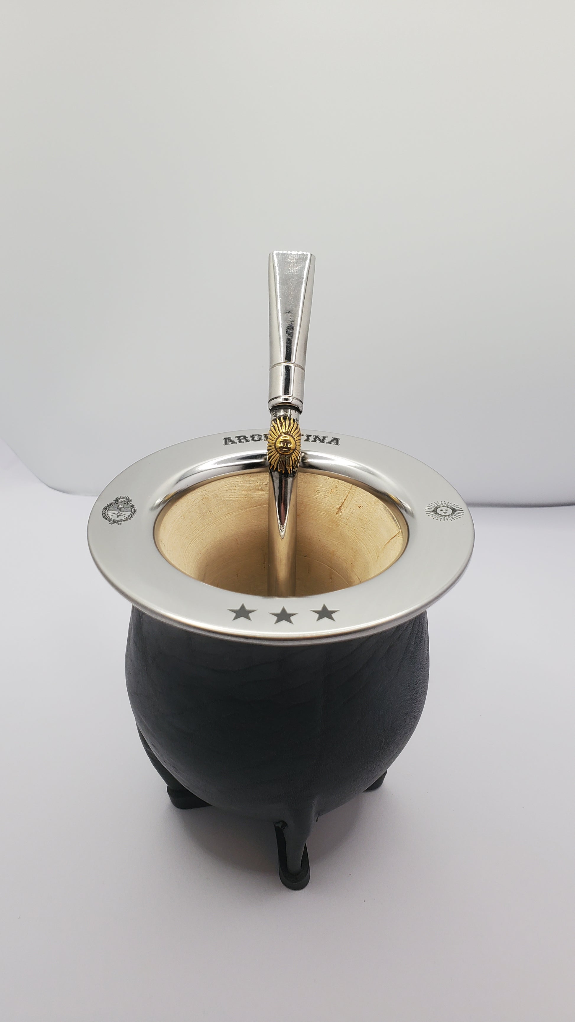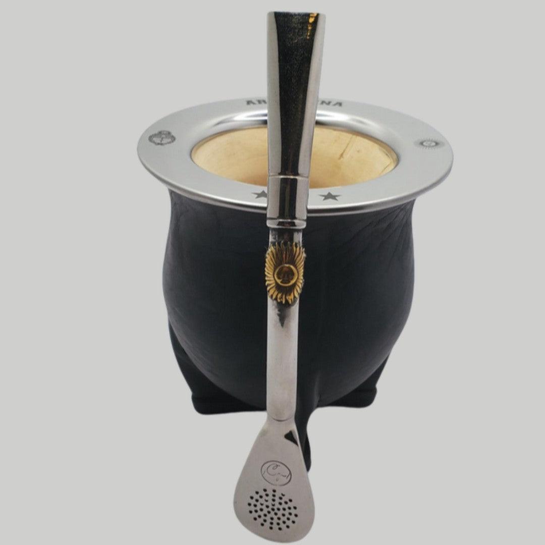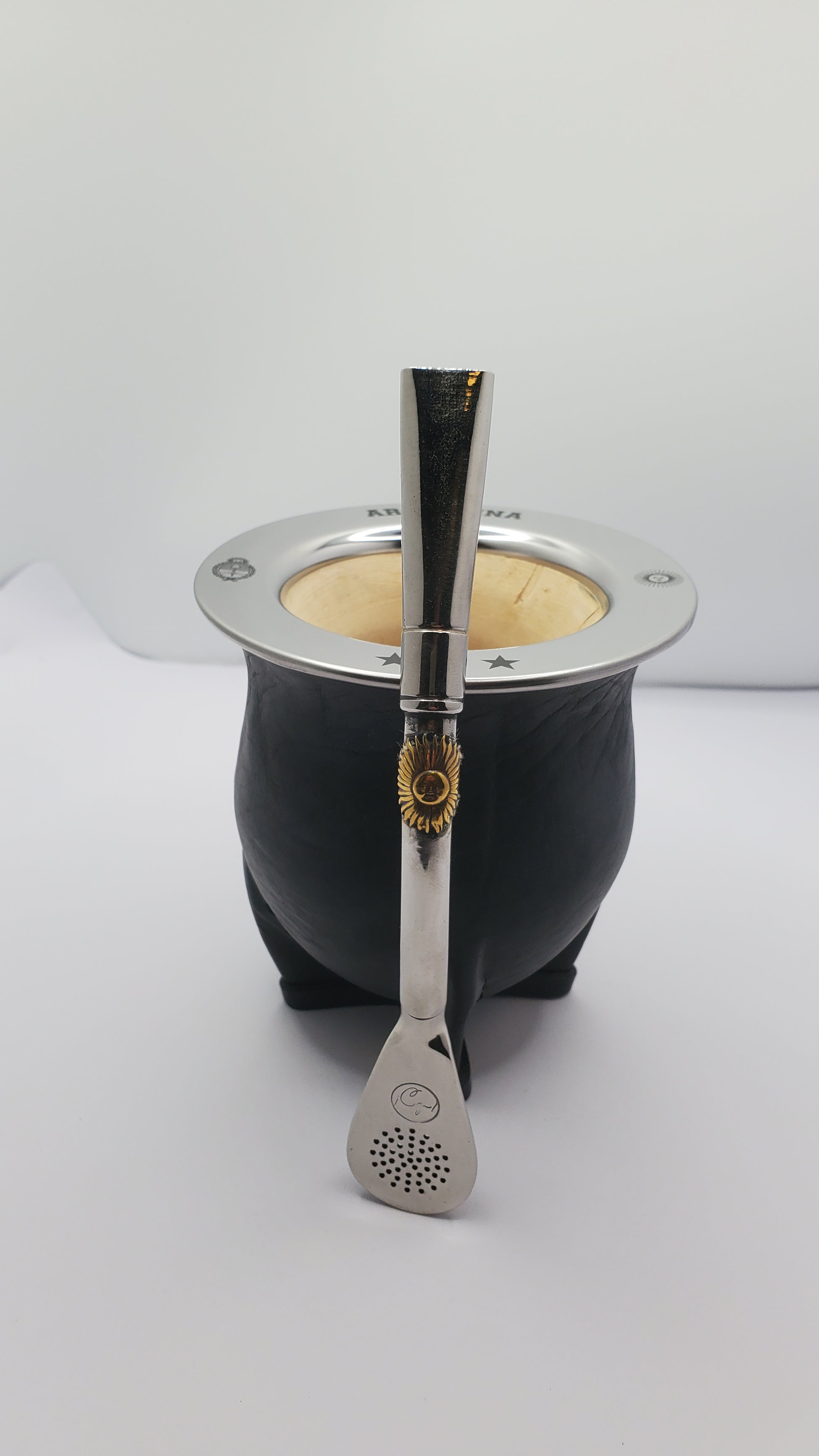 Wahlweise Mate Camionero aus Kürbis mit Leder überzogen oder Mate Algarrobo (aus Johannesbrotbaum-Holz). Beide wurden graviert (siehe Bild Camionero), wobei beim Mate Algarrobo bis jetzt nur die "Sol de Mayo" im Holz eingraviert ist, bei Bestellung des Algarrobo ist die Gravur wie beim Camionero mit inbegriffen. Den Mate gibt es in Kombination mit der Edelstahl inox 304 Bombilla an der die "Sol de Mayo" (eines der Nationalsymbole Argentiniens und Uruguays) angelötet ist. Die Bombilla ist demontierbar und lässt sich dadurch auch ideal reinigen. Eine kostengünstigere Alternative wäre der Mate in Kombination mit der Bombilla Pico de Loro Bronze.