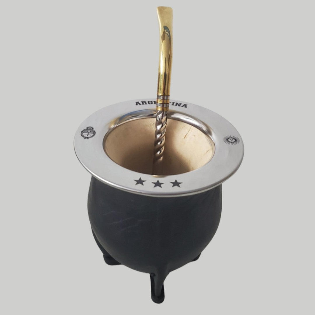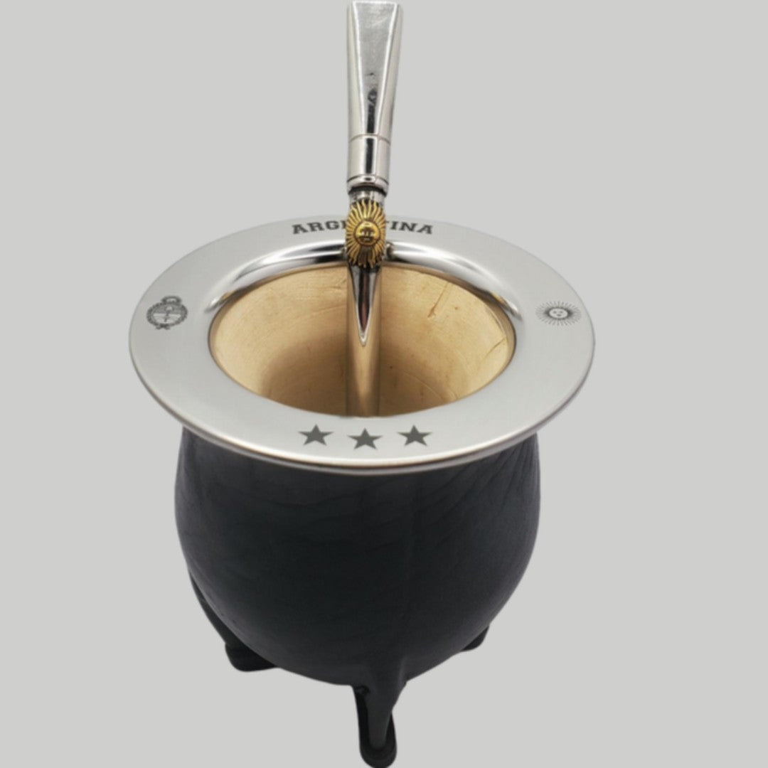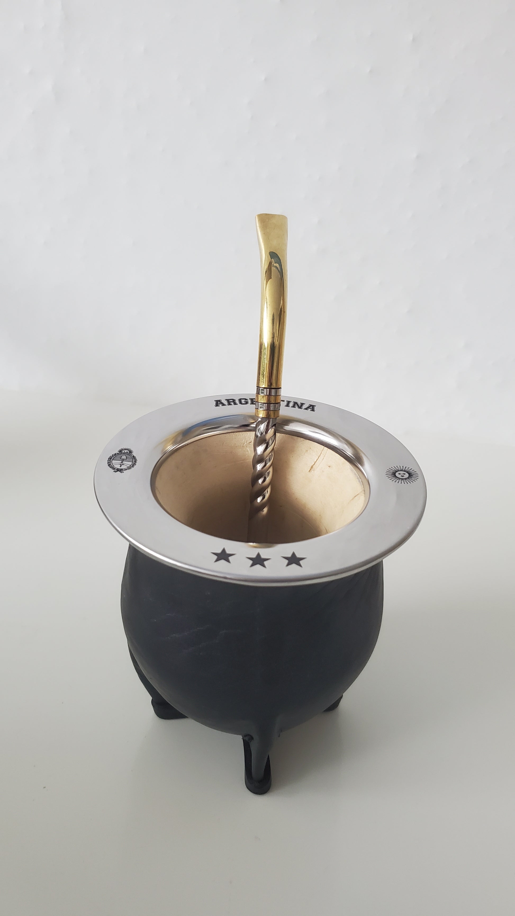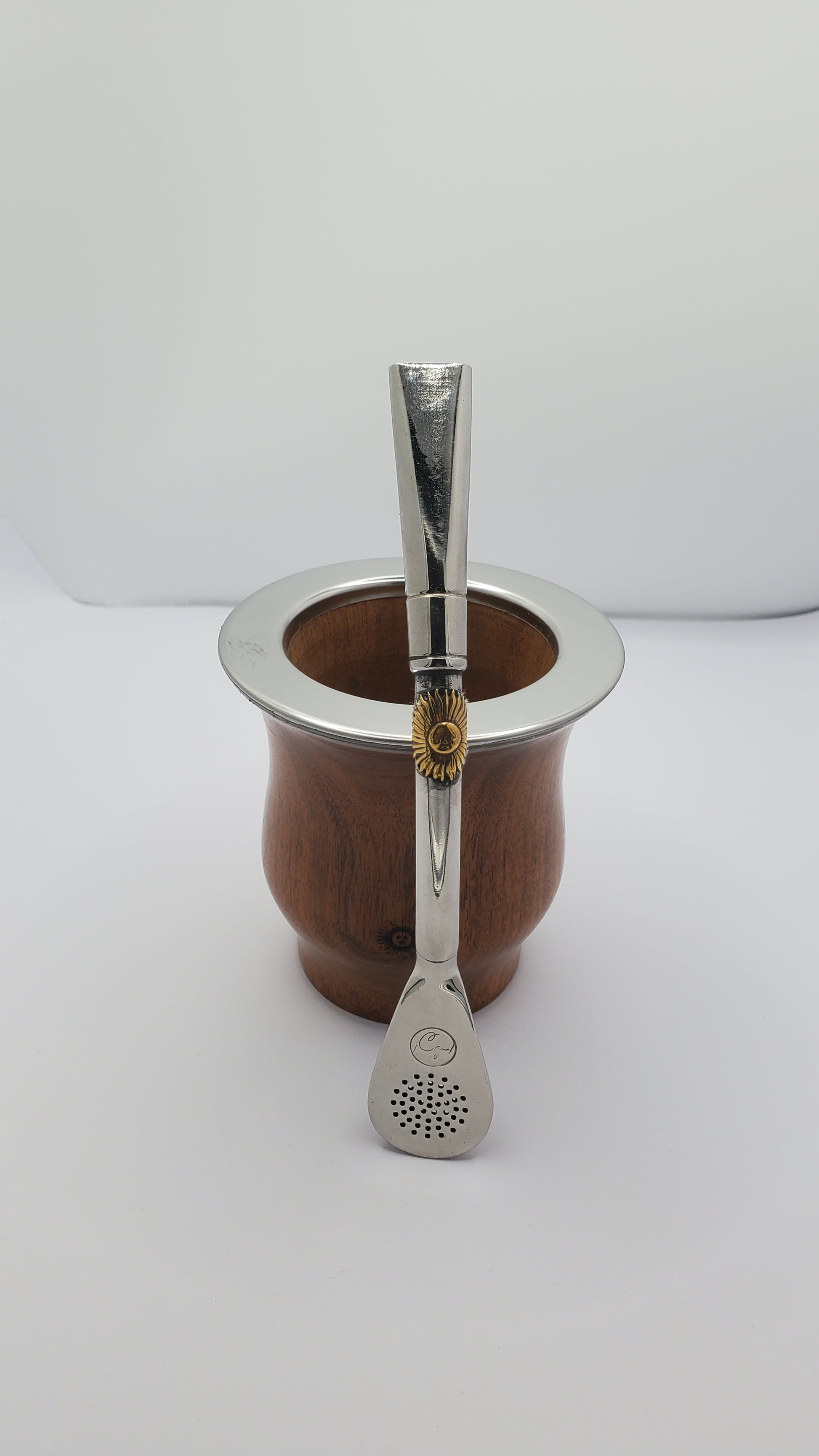 Wahlweise Mate Camionero aus Kürbis mit Leder überzogen oder Mate Algarrobo (aus Johannesbrotbaum-Holz). Beide wurden graviert (siehe Bild Camionero), wobei beim Mate Algarrobo bis jetzt nur die "Sol de Mayo" im Holz eingraviert ist, bei Bestellung des Algarrobo ist die Gravur wie beim Camionero mit inbegriffen. Den Mate gibt es in Kombination mit der Edelstahl inox 304 Bombilla an der die "Sol de Mayo" (eines der Nationalsymbole Argentiniens und Uruguays) angelötet ist. Die Bombilla ist demontierbar und lässt sich dadurch auch ideal reinigen. Eine kostengünstigere Alternative wäre der Mate in Kombination mit der Bombilla Pico de Loro Bronze.
