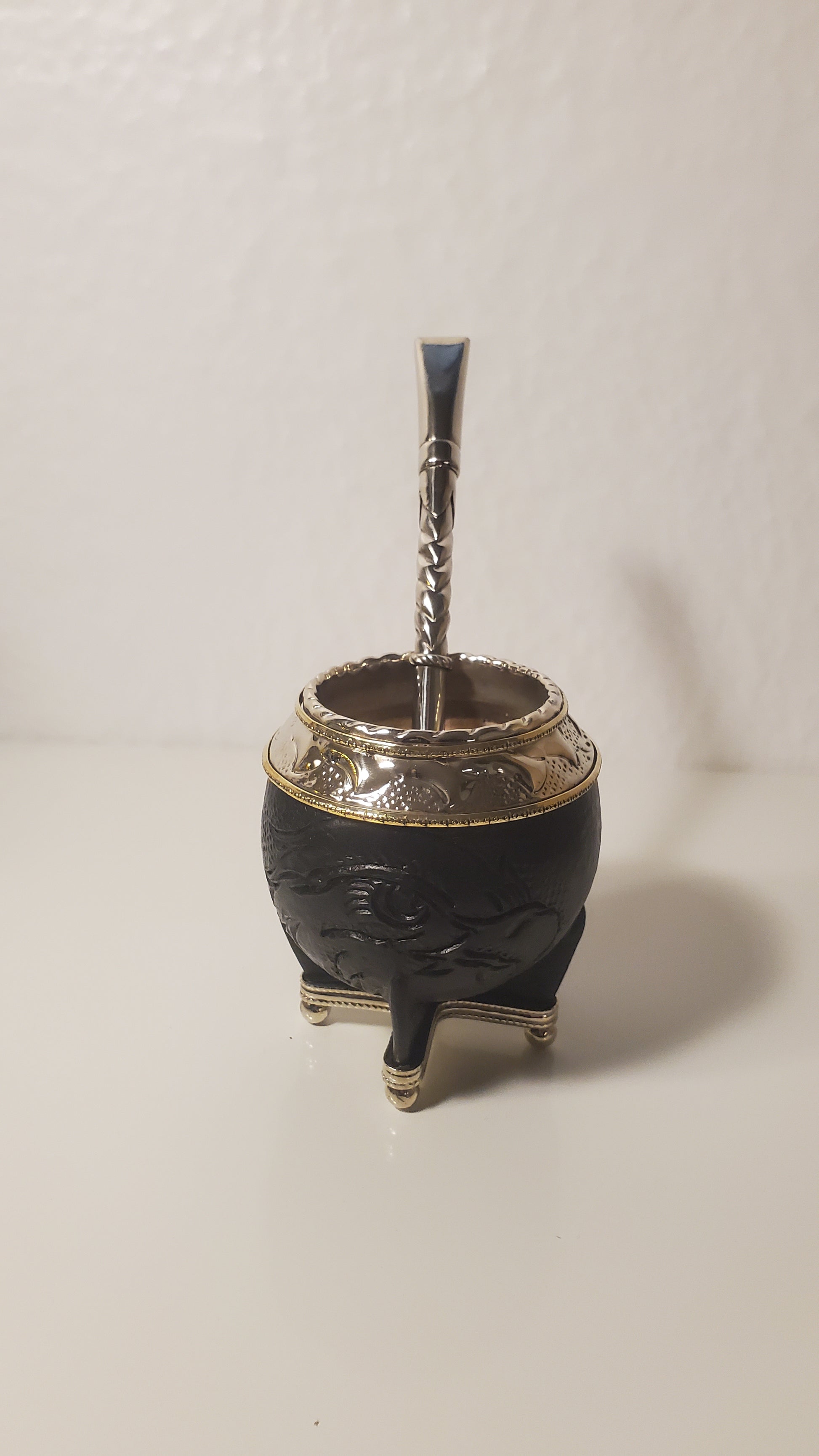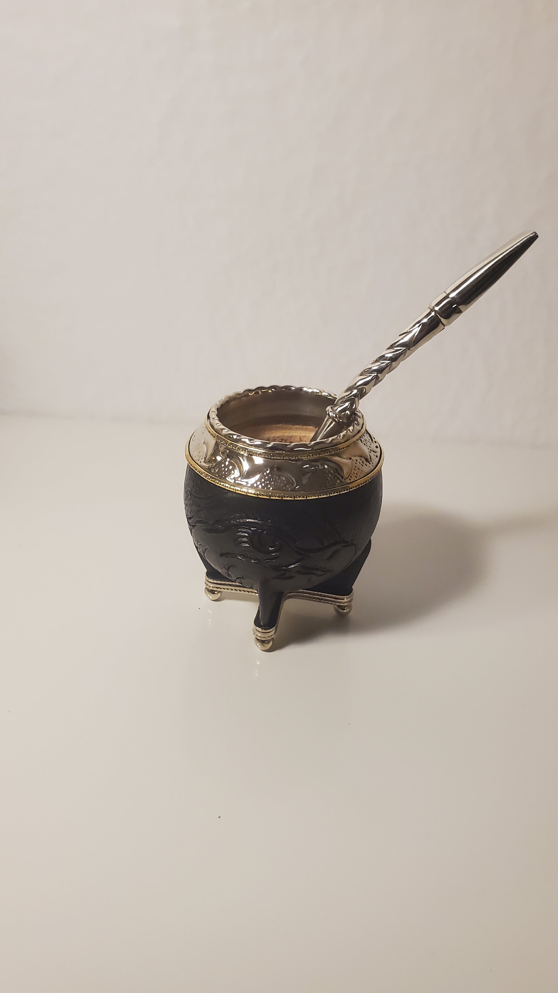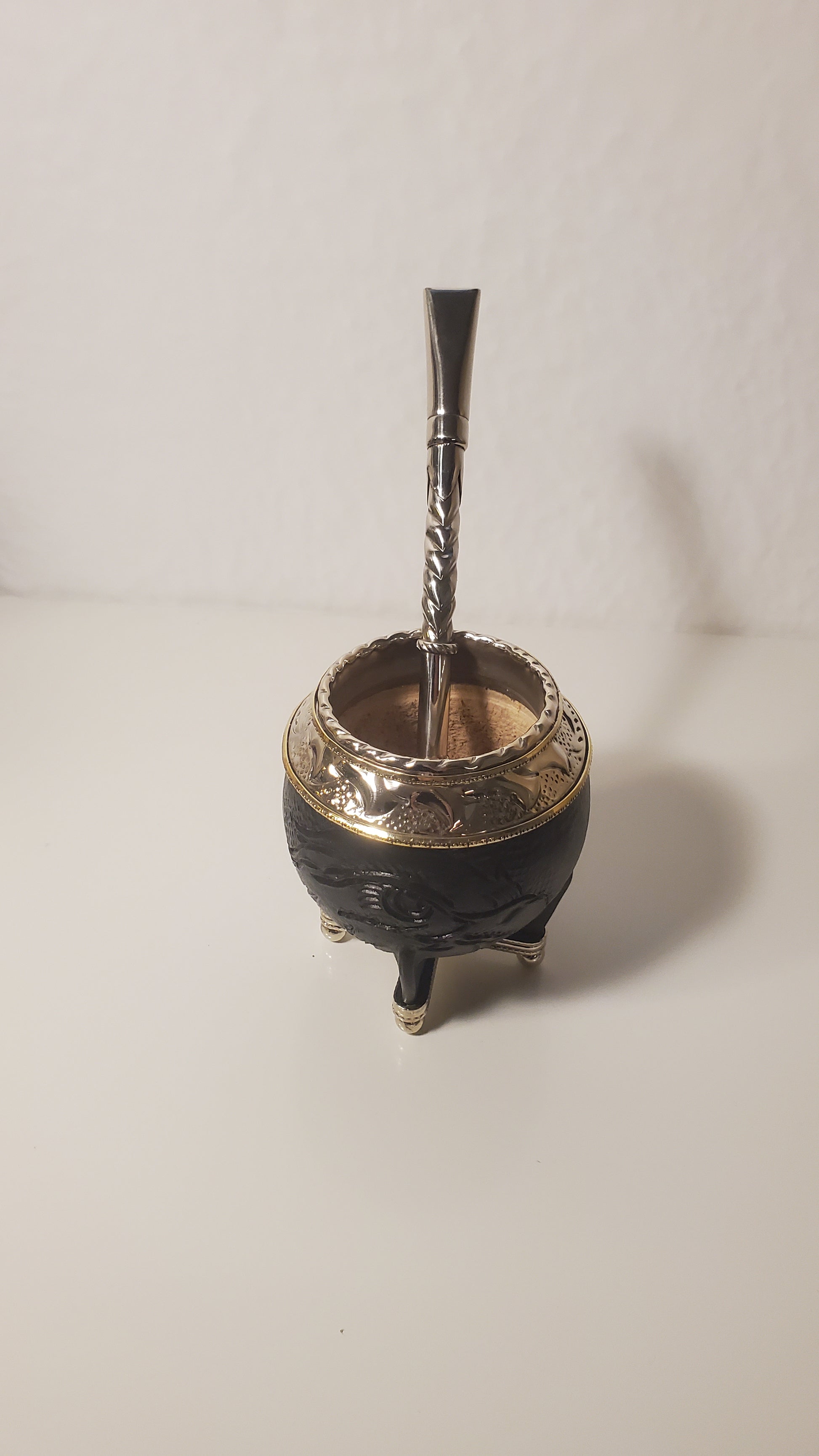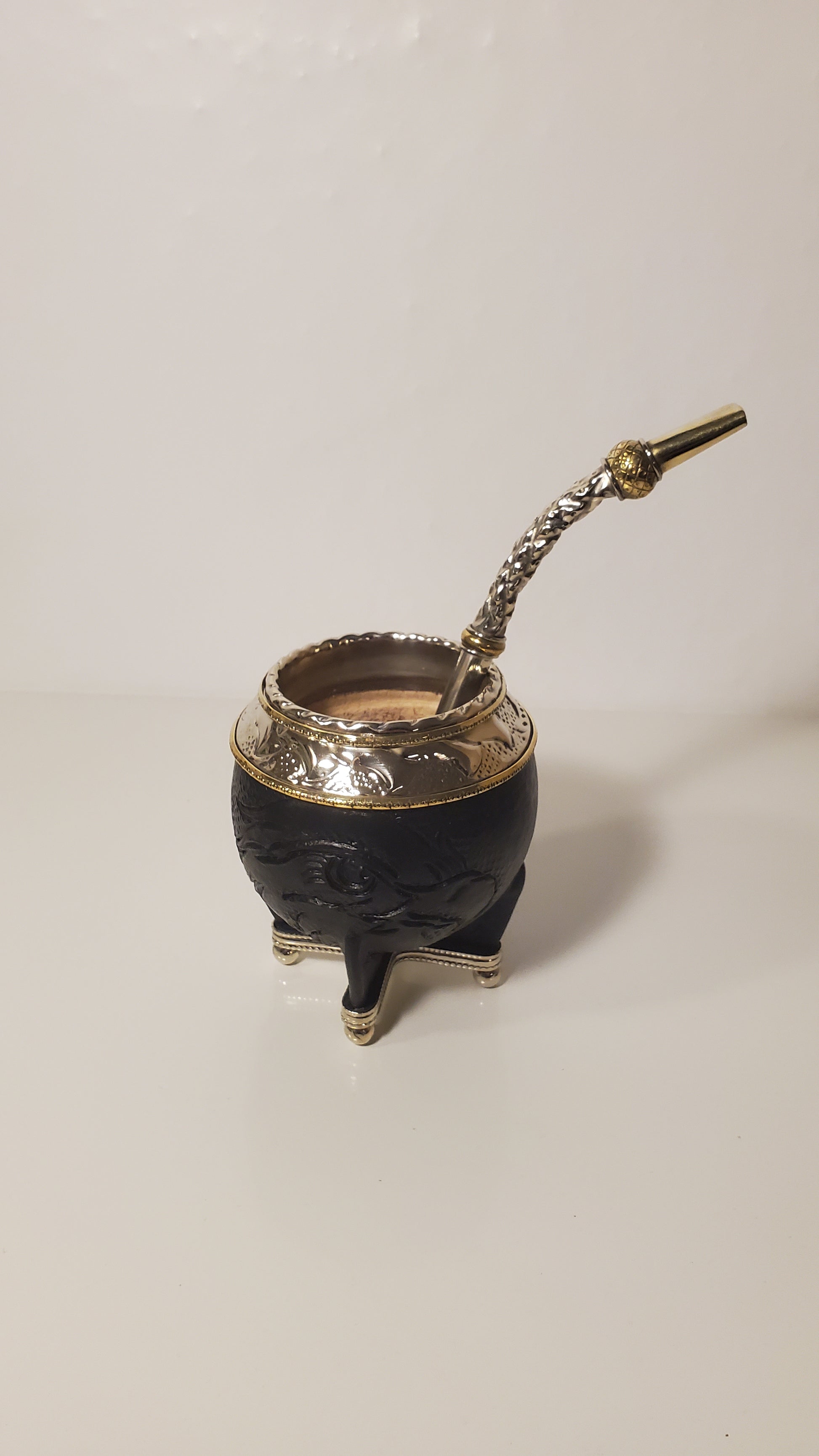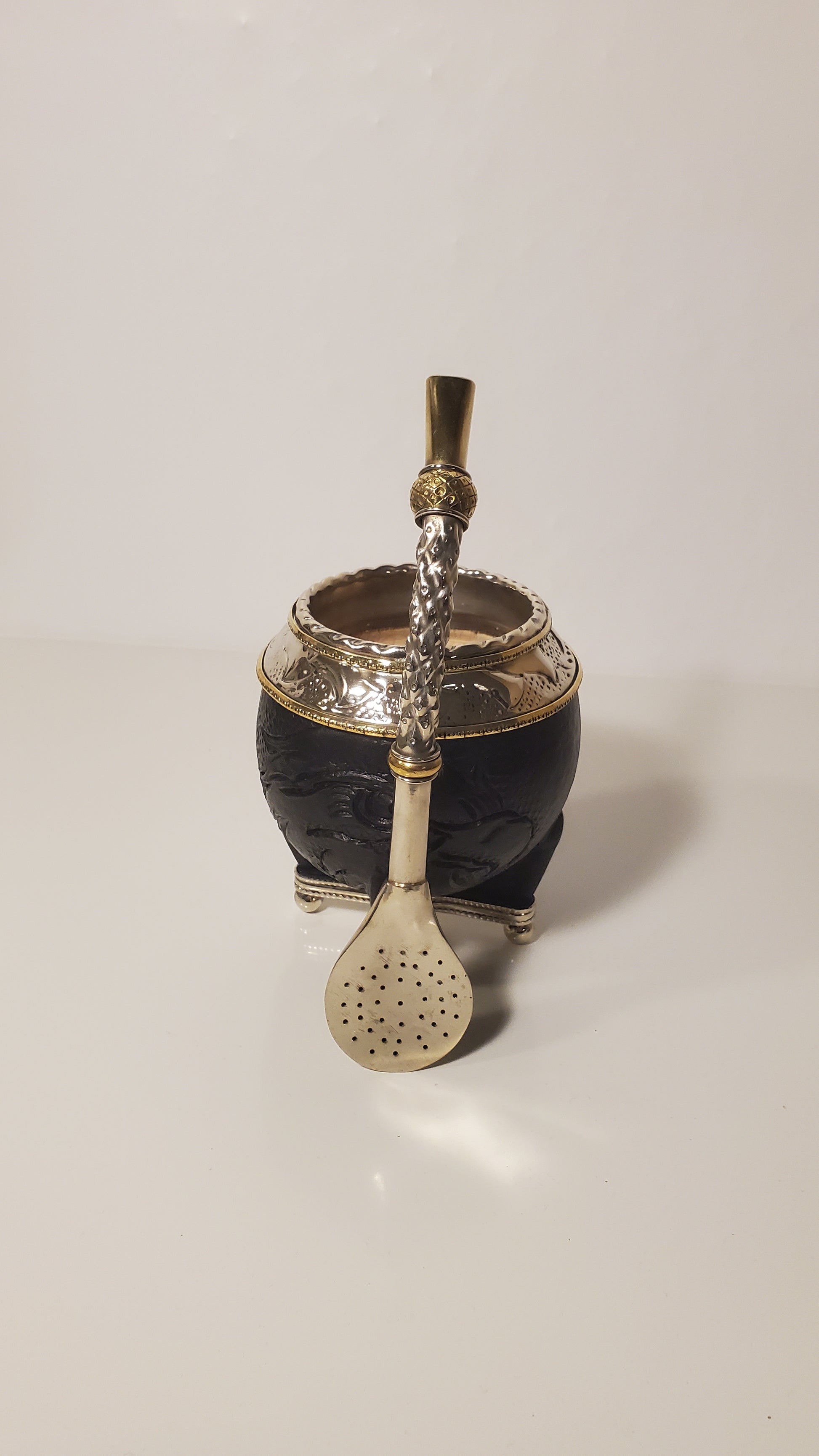 Set aus Mate Torpedo in der exklusiven Version aus schwarzem Leder mit einem ins Leder eingraviertem Adler. Innen ist der Mate aus Kürbis mit Leder ummantelt, sowohl die Füße wie auch die Zwinge sind aus Alpakasilber. In die Zwinge wurden aufwendige Verziehrungen eingemeißelt. Die Bombilla ist eine Bombillón Pico Rey oder Bombillón Semicurvo Pico Bronce welche beide zu 100% aus Alpakasilber sind und eignen sich perfekt für Yerbasorten des uruguayischen Stils (PU1) ohne das sie verstopft.