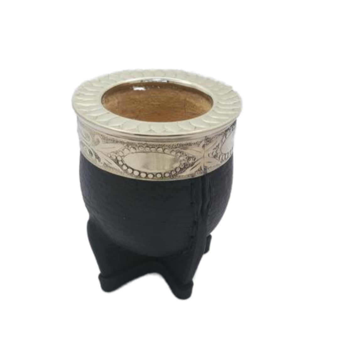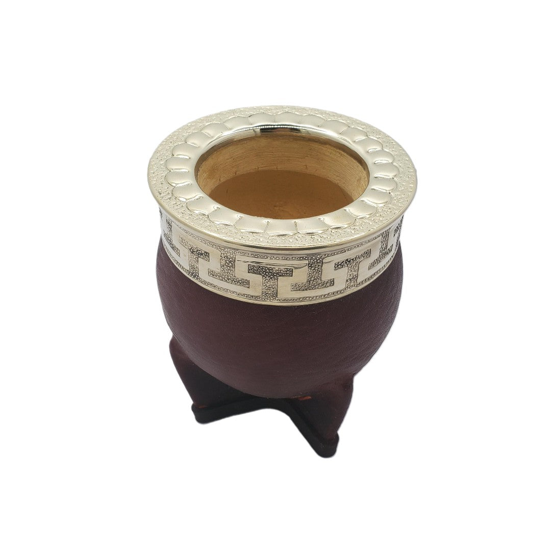 Mate Imperial der Klassiker unter den Mates. Mit aufwendigen Verziehrung wie der "guarda pampa" ist es fast schon ein Kunstwerk. Unter den Matearten hat er die meiste Füllmenge und hat einen sehr stabilen Stand (da auch sehr breit). Diese Mates wurden alle in Argentinien handgefertigt. Im Inneren sind sie aus feinem hochwertigem Kürbis gefertigt und mit Kuhleder ummantelt. Die Zwinge des Matehals ist aus Neusilber und mit unterschiedlichen Verziehrungen geschmückt.