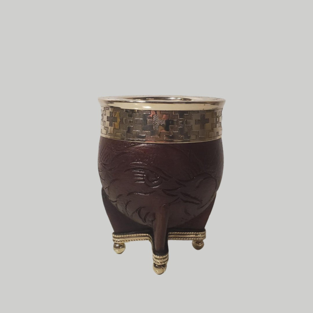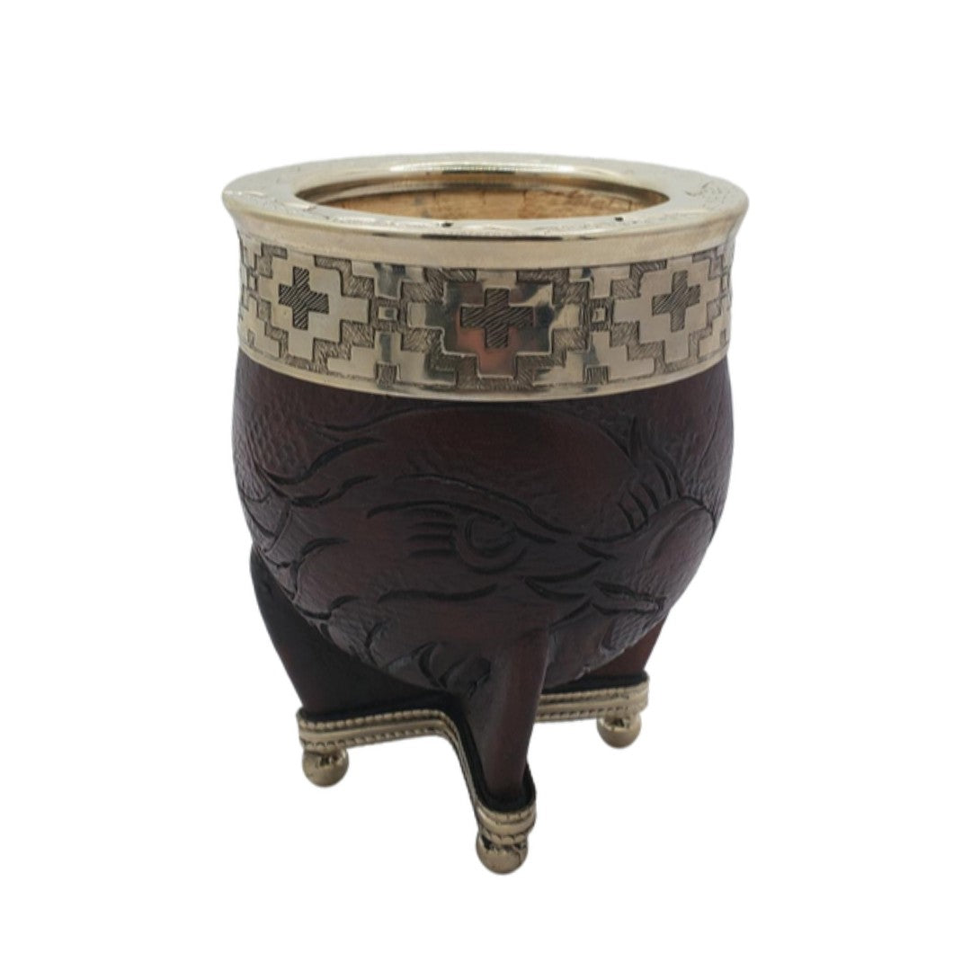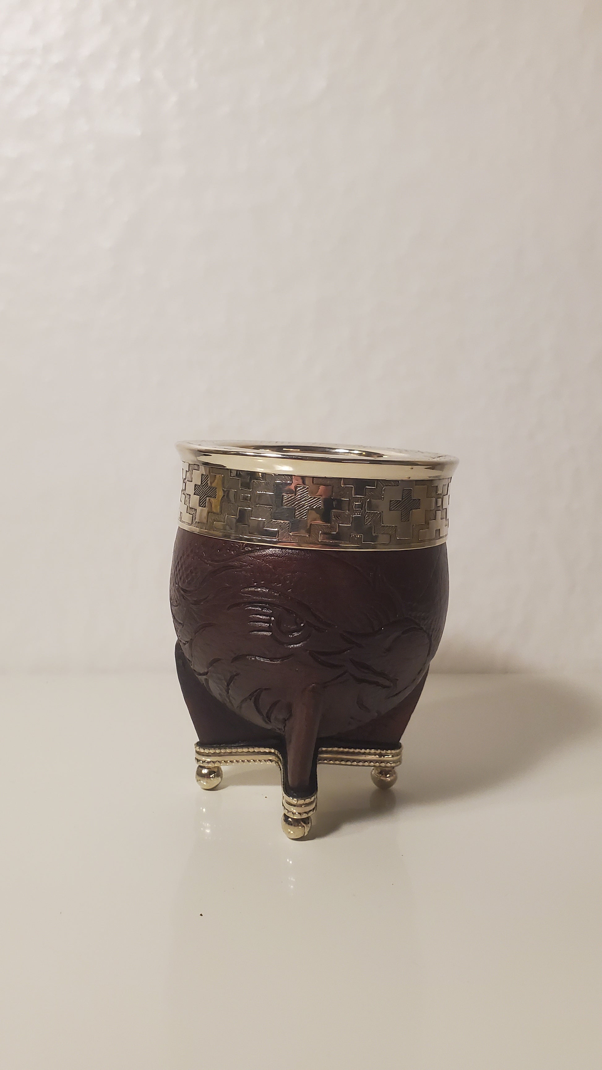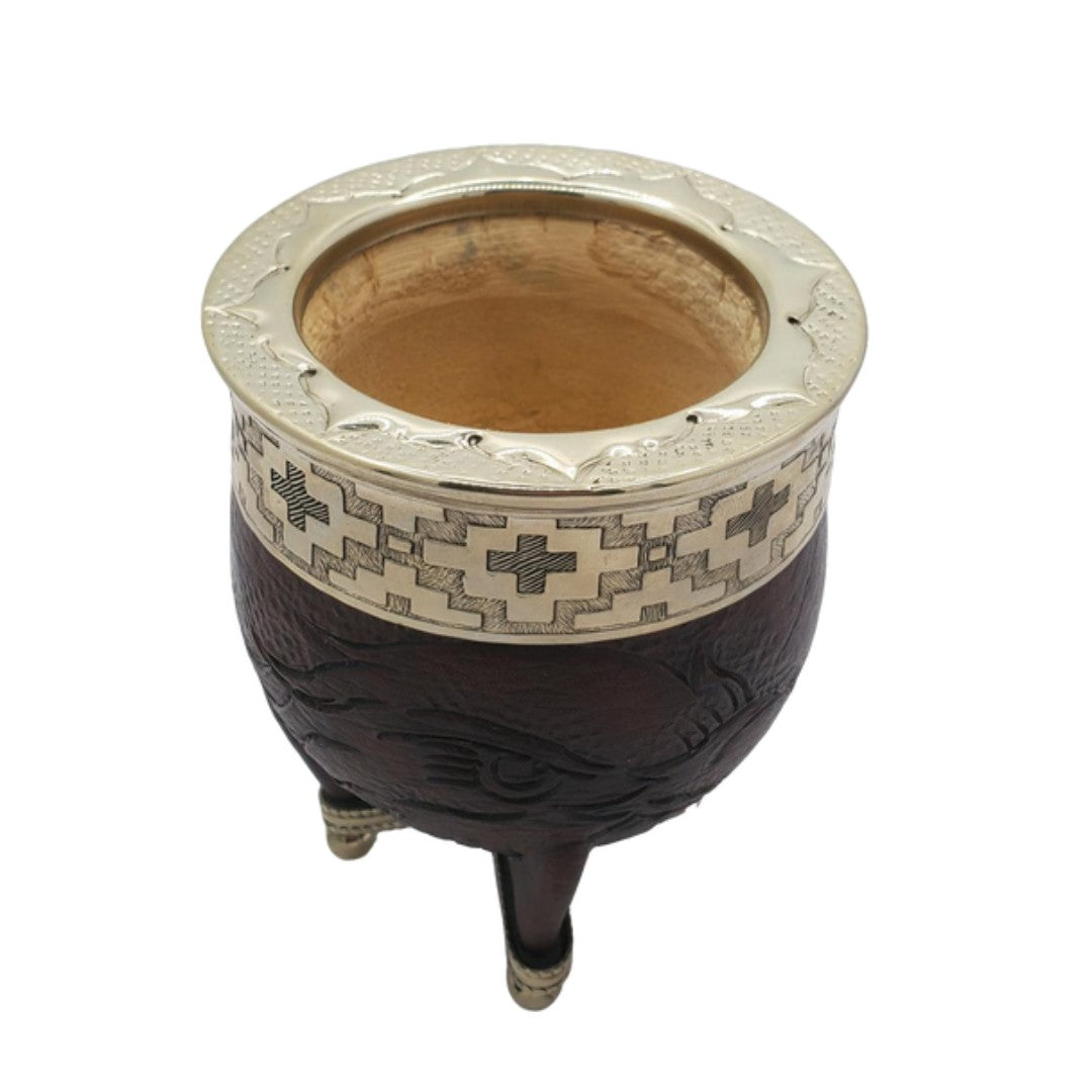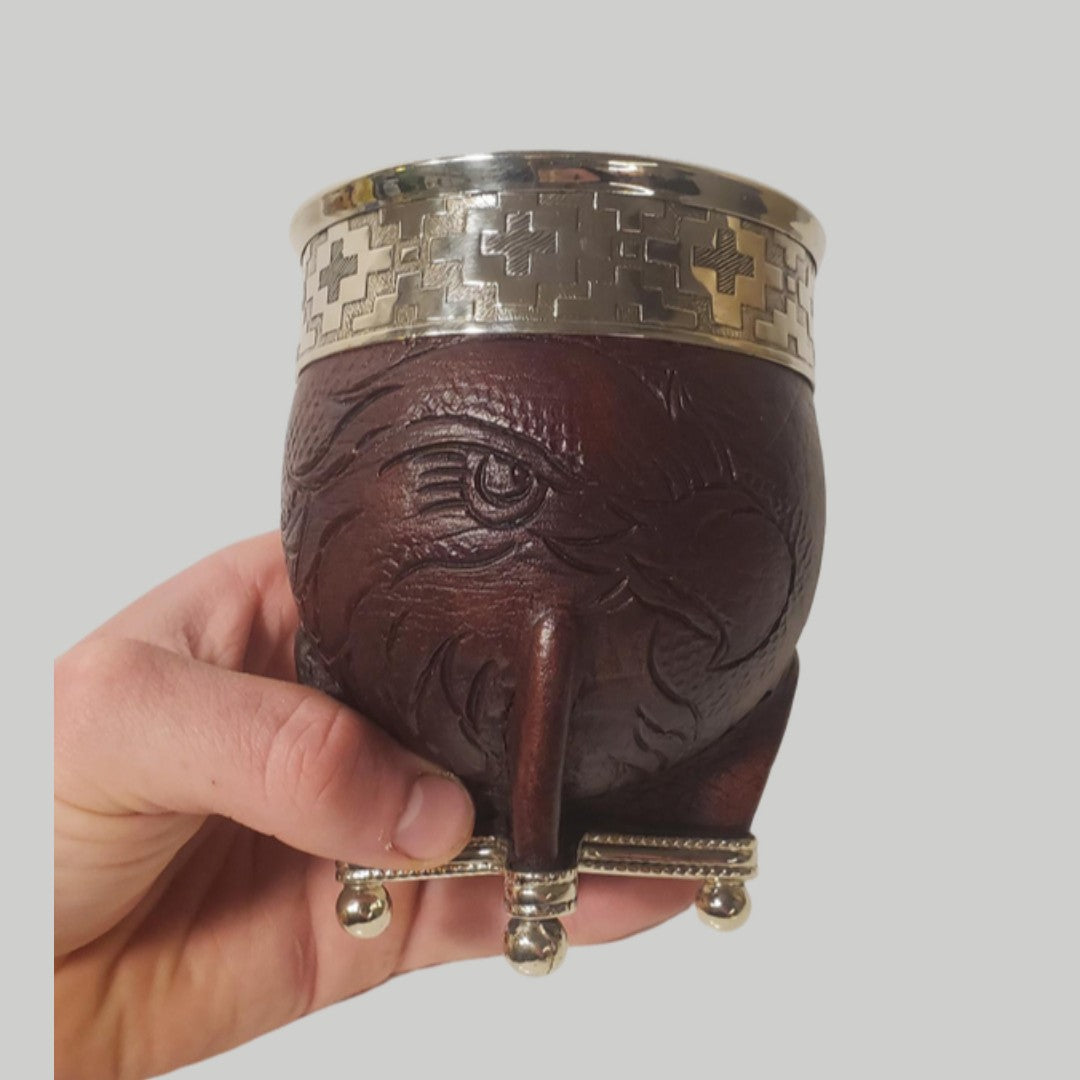Argentinische Premiumhandwerkskunst. Dieser Mate wurde per Hand in Argentinien gefertigt. Innen mit Kürbis außen Mut braunem Leder ummantelt und einem Adler aufwändig eingeschnitzt, die Füße sind aus Alpakasilber und die Zwinge ist aus Alpakasilber aufwendig gemeißelt.