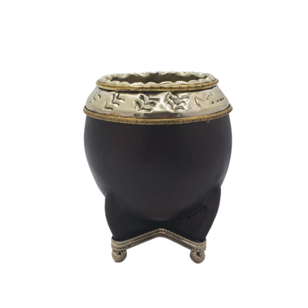 Mate Torpedo handgefertigt in Argentinien. Im Inneren aus Kürbis mit glattem braunem Leder ummantelt, die Füße sowie die Zeinge sind aus Alpakasilber und die Zwinge wurde auf wendig mit Verziehrungen gemeißelt.